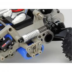 First introduced in 1983, the 2WD racing buggy Frog made a huge splash with its eye-catching design and high-performance running. The Frog now makes a comeback, updated for a new age, but with its basic structure essentially unchanged. Preserving its characteristic space frame, the oil dampers for trailing-arm type rear suspension have been updated to diaphragm type. Rear drive shaft features dog bone type joint for secure power transmission. Sleek polycarbonate body remains the same, while 3-piece wheels feature front grooved and rear spike tires for excellent off-road running.